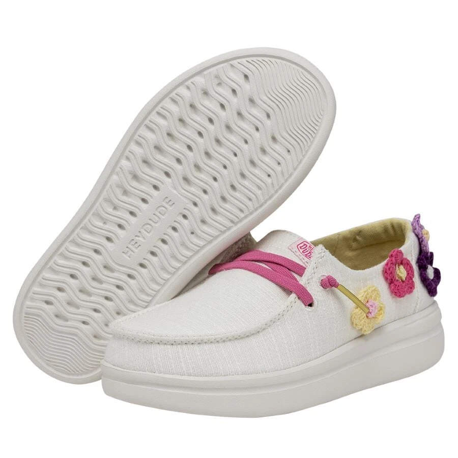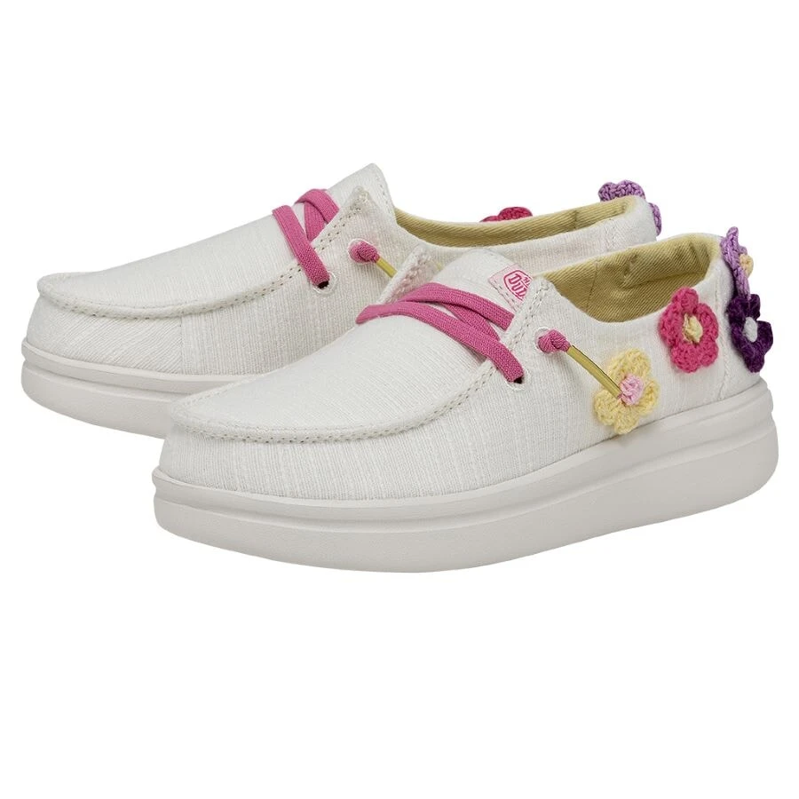 The age of Aquarius gets a modern twist with the lightweight Wendy Youth Rise collection. Showcasing a chambray-blend upper with crocheted flowers she’s sure to pick and lined with a soft cotton lining for strides meant to spring forward. Plus, a rise in the heel, for stability in every slightly-taller step. Add our reliable, outsole and she’ll be ready to rock.
